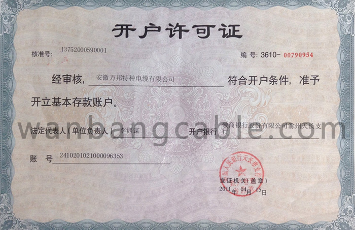 圖片名稱:開戶許可證 所屬企業(yè):特種電纜-安徽萬邦特種電纜有限公司專業(yè)特種電纜生產(chǎn)商 更新時間:2013.12.06